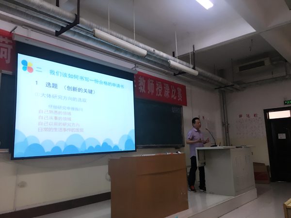 4月22号下午,我校在2号实验楼102教室举办了关于科研项目申请相关知识的讲座,李校长、蒋处长及部分教师参加了此讲座。