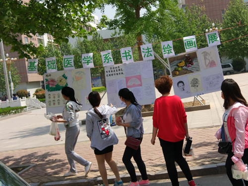 四月的校园,春意盎然,鸟语花香。这次书画展活动,同学们积极踊跃投稿,经过基础医学部办公室筛选出优秀作品予以展览。展览的作品题材丰富,形式多样,风格鲜明:从书法上看,有方正规矩的正楷、有万马奔腾的草书;从绘画上看,有写意的牡丹画,有抒情的素描画。活动现场人潮涌动,本次书画展吸引了大批同学来参观。