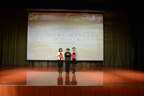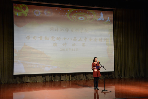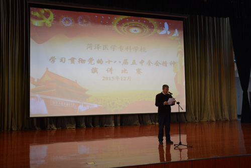 12月29日下午,在学校学术报告厅举办了学习贯彻党的十八届五中全会精神演讲比赛。由学校各党总支、直属支部推荐的9名青年教师参加了比赛。学校办公室主任、宣传部部长、学生工作处处长、团委书记及党总支、直属支部书记担任比赛评委。校党委班子成员、全体教职工党员、学生党员及党员培养对象现场观看了比赛。