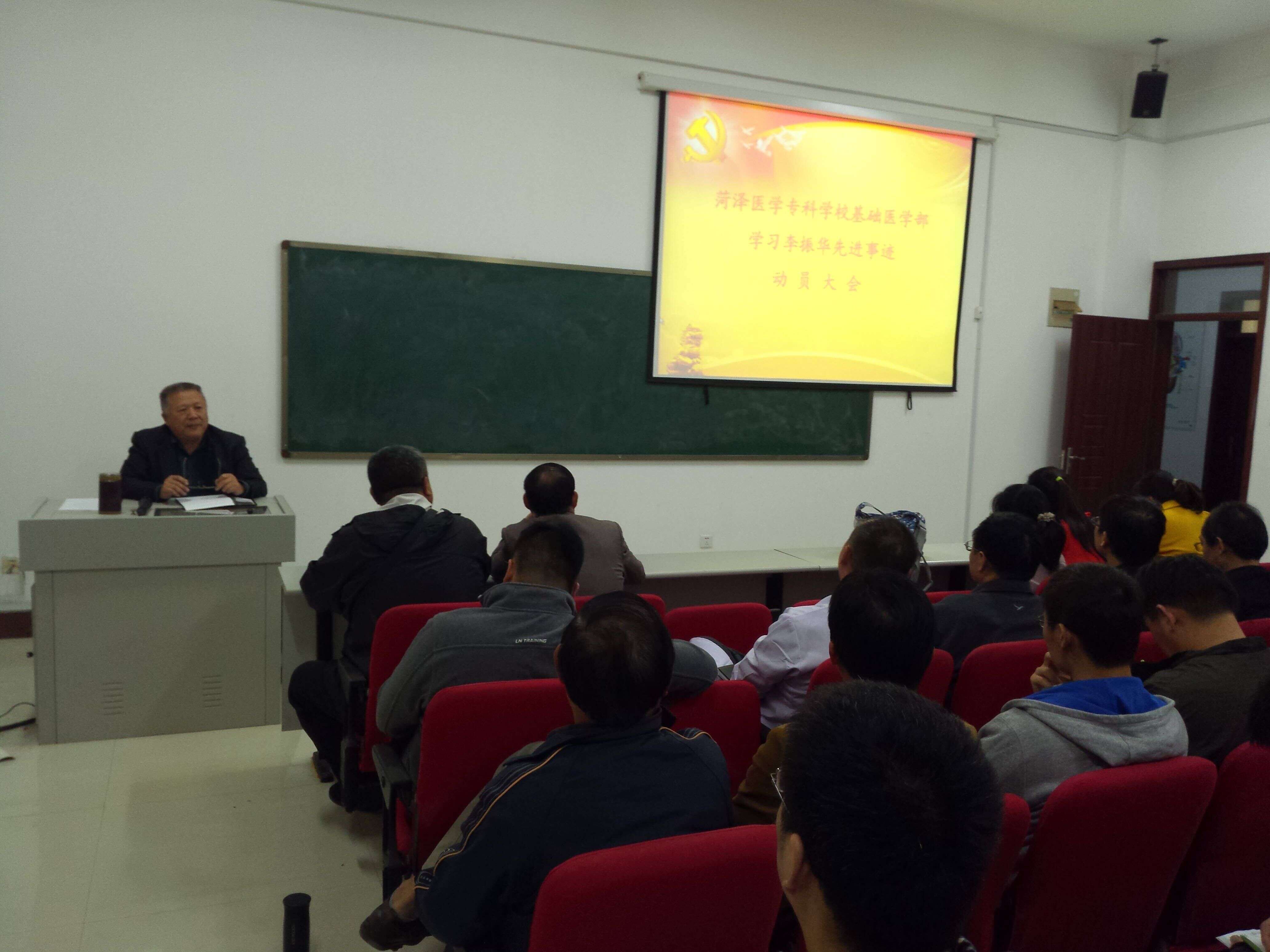 10月29日下午,基础医学部在1号实验楼召开全体教师大会,布置动员学习李振华同志先进事迹。总支书记赵信立同志主持会议。