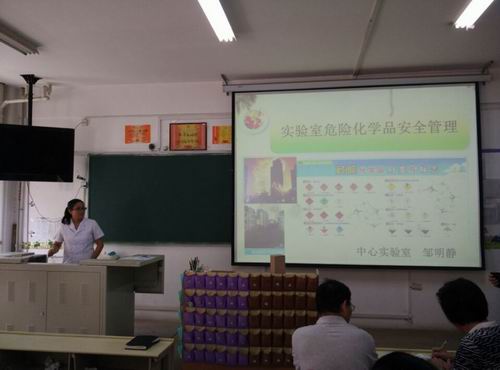 按照实验室安全周活动安排,9月2日下午,中心实验室邹明静老师在2号实验楼202教室为全体实验室人员作了《实验室危险化学品安全管理》的专题报告。副校长李琳、教务处处长蒋继国和各教学系部负责人听取了报告。