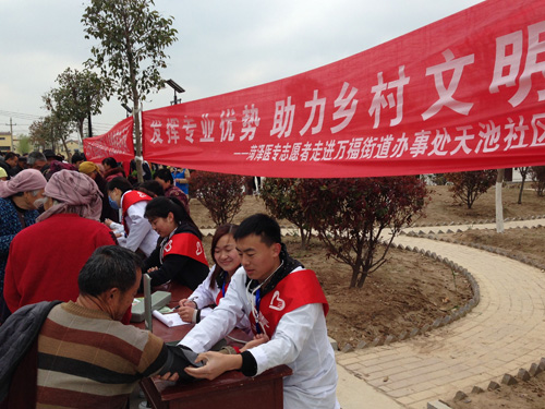 4月13日,全省“乡村文明——青年志愿者在行动”现场观摩会在菏泽市召开,团省委书记张涛、省文明办专职副主任王少杰和全省17地市团市委、文明办等负责同志参加,学习观摩菏泽市在乡村文明建设工作方面的优秀经验和做法。按照共青团菏泽市委统一安排,我校一支由15名师生组成的志愿者服务队赴高新区万福街道办事处天池社区为当地居民进行免费健康查体、健康生活方式宣传活动。