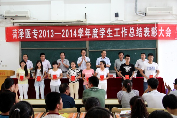 6月18下午,我校2013-2014学年度学生工作总结表彰大会在药学楼礼堂隆重举行。学校领导刘心臣、学生工作处处长张传宝、团委书记郭树榜及各系部书记、副书记出席大会并为获奖集体和个人颁奖。会议由团委书记郭树榜主持。全体辅导员和学生处、团委全体人员参加了会议。团委书记郭树榜宣读《菏泽医学专科学校关于表彰2013-2014学年度学生工作先进集体和先进个人的决定》,学生工作处处长张传宝作了工作报告。