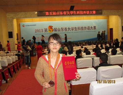 10月13日至15日,由山东省科协、山东省教育厅共同主办的“第五届山东省大学生科技外语大赛”在山东交通学院长清校区圆满落幕。来自全省54所高校的近200名选手参加了此次比赛。在我校各级领导的大力支持和关怀下,在外语教研室老师的精心指导下,护理系2012级张丙娜同学凭借其扎实的语言知识基础、流畅的英语口语和良好的竞技水平,在比赛中脱颖而出,荣获“三等奖”,为学校争得了荣誉。(外语教研室)