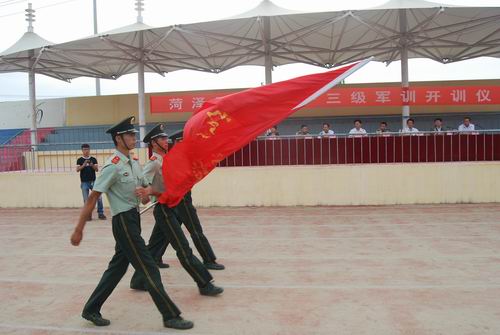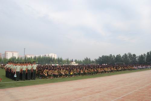 开学典礼闭幕后,随后举行了新生军训开训仪式,仪式由副校长袁志勇同志主持,学工部部长、军训团政委张传宝同志宣布了军训团建制,校党委书记付章丽为军训团授旗,工会主席刘心臣同志讲话,指出开展军训的重要意义,要求同学们树立正确的态度,严格要求,刻苦训练,在训练中尊敬教官,团结友爱,严格纪律,注意安全,争取在军训会操表演中取得优异成绩。
