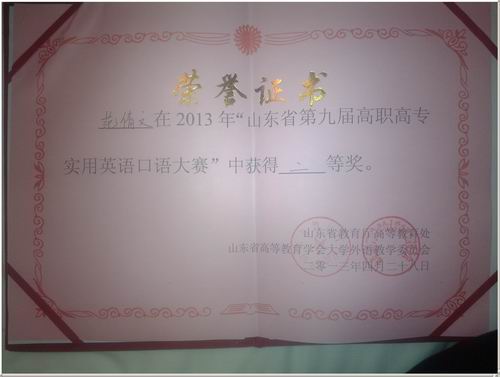 4月28日,由山东省教育厅主办的“山东省第九届高职高专实用英语口语大赛”在山东商业职业技术学院圆满落下帷幕。来自全省的65所高职类院校99名学生参加了此次比赛。在我校各级领导的大力支持和关怀下,在外语教研室老师的精心指导下,护理系2011级涉外护理专业范倩文同学,凭借其扎实的语言知识基础、流畅的英语口语和良好的竞技水平,在比赛中脱颖而出,荣获“二等奖”。范倩文同学的精彩表现证明了自己的英语应用能力,也充分展示了我校英语教学水平和综合实力,为学校争得了荣誉,扩大了我校的社会影响。