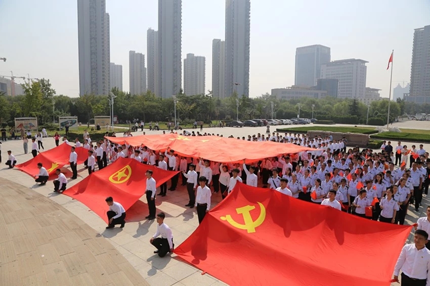 活动在升国旗、奏国歌中拉开了序幕。我校共青团员代表全市21万共青团员庄严承诺,同人民一道拼搏、同祖国一道前进,服务人民,奉献祖国,勇做走在时代前列的奋进者、开拓者、奉献者。随后,党员、团员及少先队员重温入党、入团、入队誓词,党旗、团旗、队旗依次排开,交相辉映,党员、团员、队员共同抒发对祖国的热爱之情。活动最后,8名青年代表领唱《我和我的祖国》,伴随着歌声,巨幅国旗从众人头顶缓缓移动到队伍前方,大家挥动手中的国旗,并齐声高喊“庆祝中华人民共和国成立70周年!”