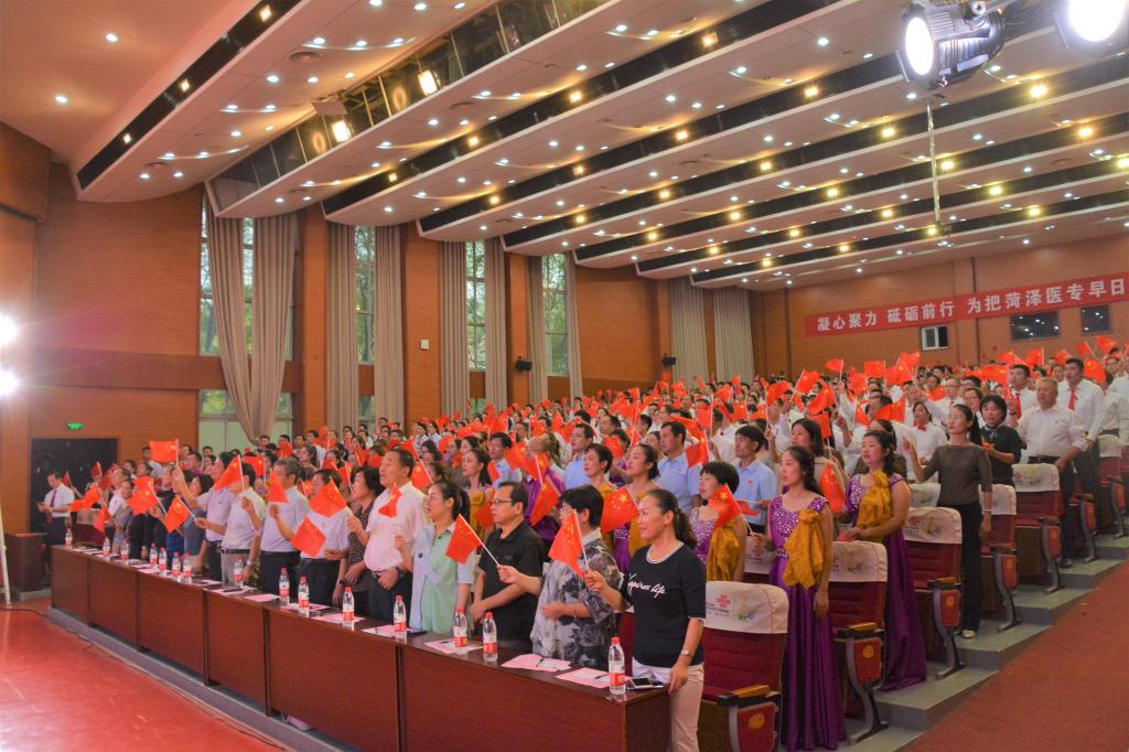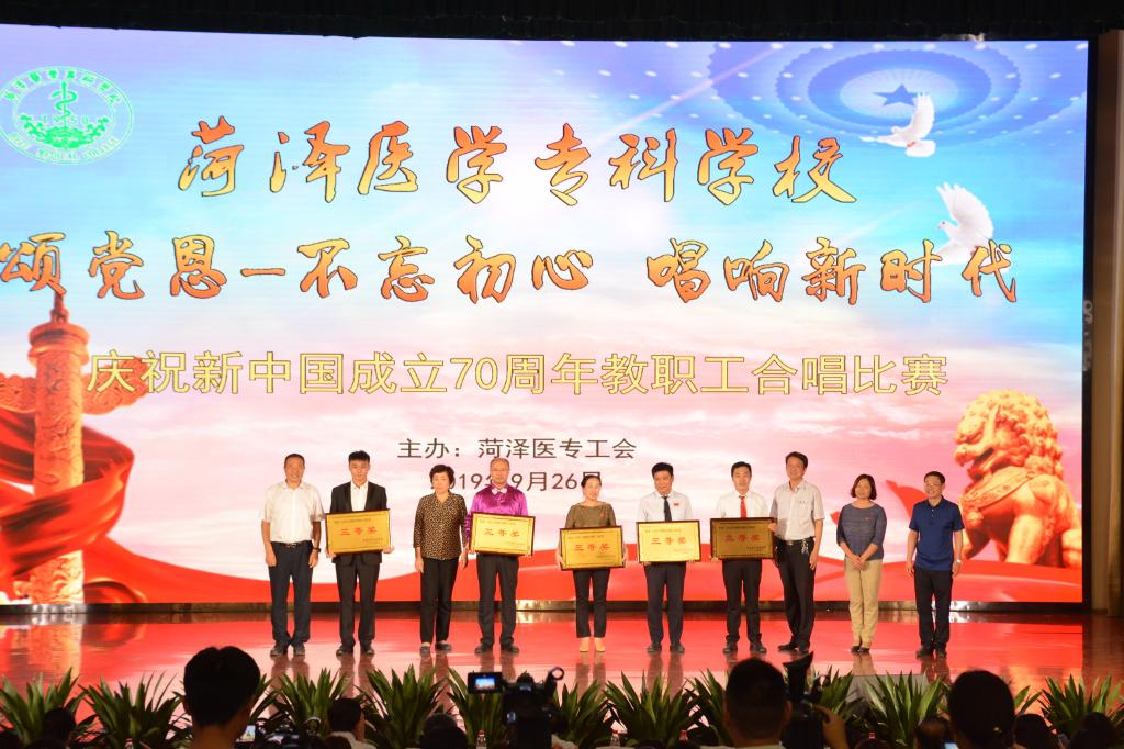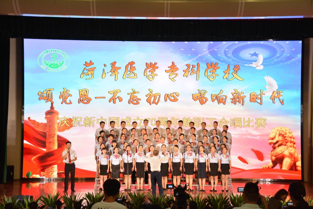 在新中国70华诞来临之际,为进一步推动“不忘初心、牢记使命”主题教育深入开展,激发全校师生爱党、爱国、爱校的热情,9月26日下午,我校在学术厅举办了“颂党恩—不忘初心唱响新时代,庆祝新中国成立70周年教职工合唱比赛”,来自全校8个代表队和省卫生健康委老干部艺术团菏泽医专分团的300多名教职工用最饱满的热情、最嘹亮的歌声礼赞新中国、讴歌新时代。学校党委书记于洲声,党委副书记、校长顾润国,党委副书记、工会主席周长文,副校长刘心臣、李琳,纪委书记吴晓露,副校长张传宝、蒋继国出席活动并担任评委。全体教职工和学生代表共500多人观看了比赛。
