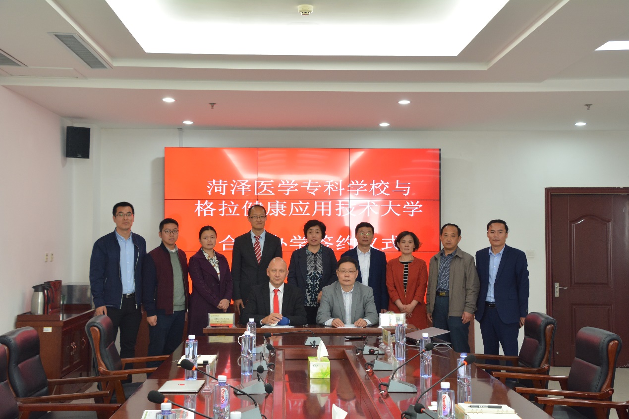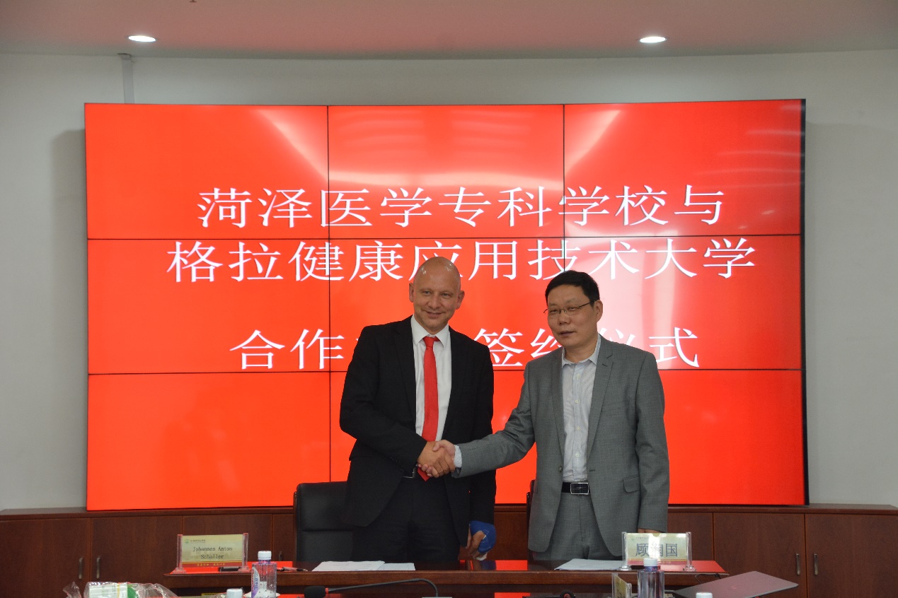 10月8日上午,我校与德国格拉健康应用技术大学(SRH)合作洽谈会议暨合作办学签约仪式在第一会议室举行。双方将合作开展康复治疗技术专业高等专科层次办学,就师资培养、学术交流及学生升学、就业开展合作。德国格拉健康应用技术大学校长Johannes Anton Schaller一行四人,我校校长顾润国,副校长李琳、蒋继国等领导出席了洽谈会及签约仪式。