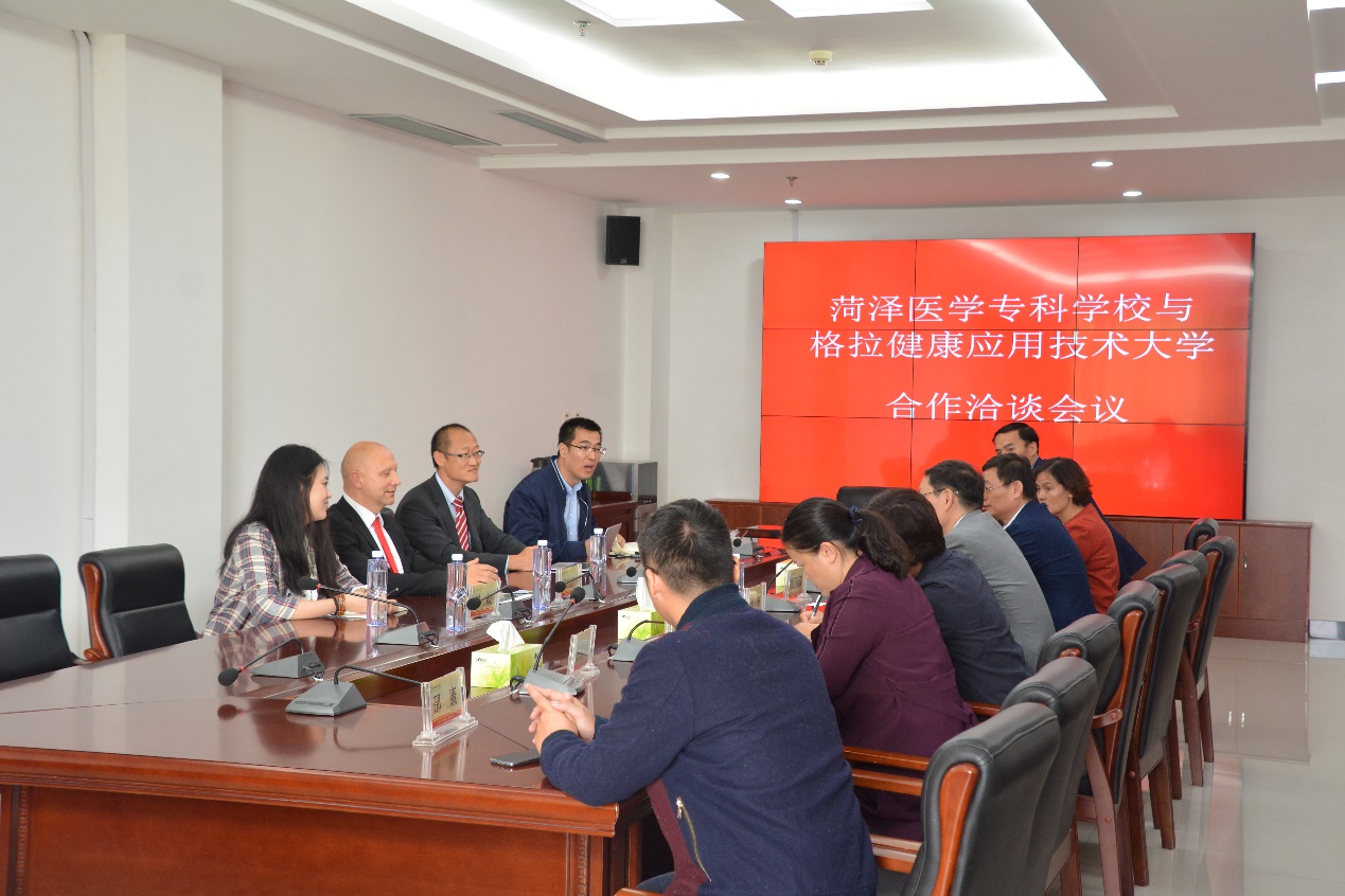 会前,德国来访人员到我校附属医院教学基地参观考察了康复治疗技术专业实训室、附院康复治疗中心。德方对我校康养技术相关办学实力给予充分认可。会议洽谈期间,顾润国向德方介绍了我校的办学历史、教育理念以及康复专业教学特色,对两校合作寄予了美好期望。Johannes Anton Schaller通过PPT展示了格拉学院的校园环境与办学情况,并介绍了该校康养专业人才培养和教育培训等方面的特色。随后,双方就合作办学事项进行了深入交流沟通,展示了各自特色优势,探讨了开展校际合作交流的美好前景及扩大教学领域合作的可能性。