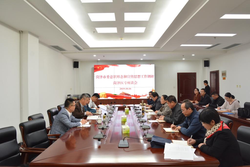 10月16日上午,菏泽市委宣传部副部长、市委讲师团团长樊玉占一行三人来我校调研党委意识形态责任制落实情况和“学习强国”推广使用情况,在图书楼六楼第一会议室召开座谈会。学校党委书记于洲声,党委副书记周长文,宣传部、学生处、各系部党总支书记及“学习强国”学习平台管理员参加座谈。座谈会由周长文主持。