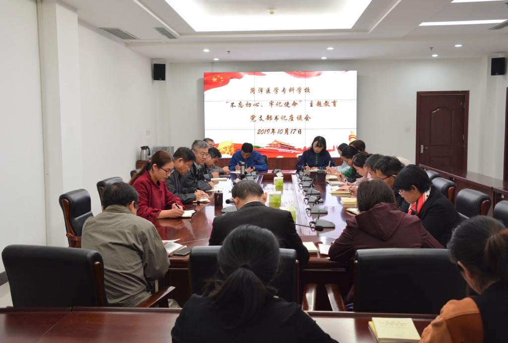 按照学校“不忘初心、牢记使命”主题教育部署安排,10月17日下午,我校在第一会议室组织召开“不忘初心、牢记使命”主题教育党支部书记座谈会,党委书记于洲声、党委副书记周长文及全校各党支部书记共20余人参加座谈。办公室、组织部、宣传部负责人列席会议。座谈会由周长文主持。