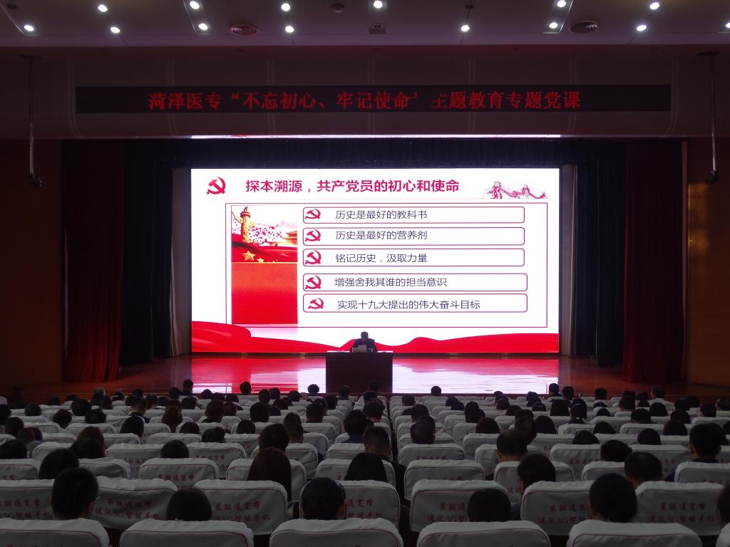 按照省卫健委部署要求和学校主题教育工作的安排,10月30日下午,我校党委书记于洲声以“不忘初心使命、勇于担当作为”为题,为全体党员干部讲授了主题教育专题党课。省卫生健康委主题教育高校指导组副组长季鹏远一行三人到会指导。学校班子成员、全体党员干部300余人聆听了本次党课。