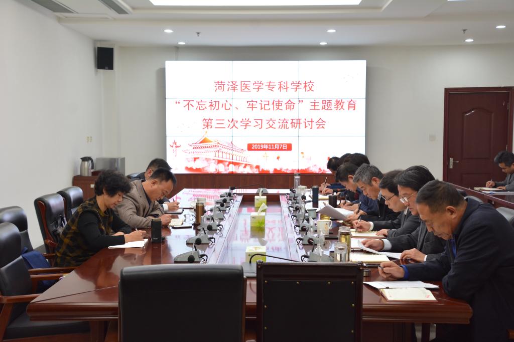 11月7日下午,我校在图书馆第六会议室召开“不忘初心、牢记使命”主题教育第三次学习成果交流研讨会。省卫生健康委“不忘初心、牢记使命”主题教育指导组副组长季鹏远,成员陈雨、赵攸文及学校党委领导班子全体成员参加了交流研讨。本次研讨会以“严明政治纪律和政治规矩,强化廉洁自律”为主题,学校党委书记于洲声主持研讨会。