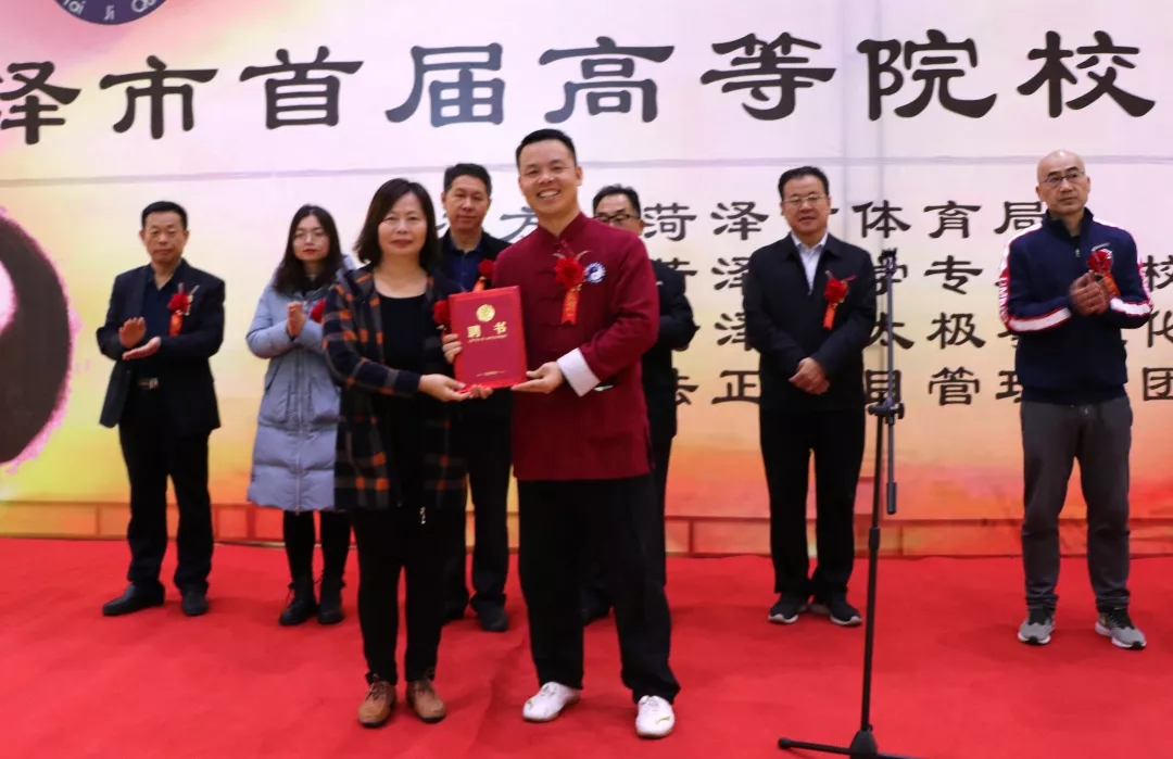 比赛在庄严的国歌中拉开序幕。吴晓露致欢迎辞,她指出,太极拳是中华优秀传统文化在武术中的最好诠释,是“国粹”,在被称为“武术之乡”的菏泽,太极文化底蕴更为深厚;高校是文化知识传承的基地,让太极文化走进校园,既能让学生强身健体,又加强了优秀传统文化教育,增强了文化自信。随后,她为菏泽市太极拳文化研究会副会长兼秘书长王旭望颁发了菏泽市医学专科学校太极拳教练聘书。