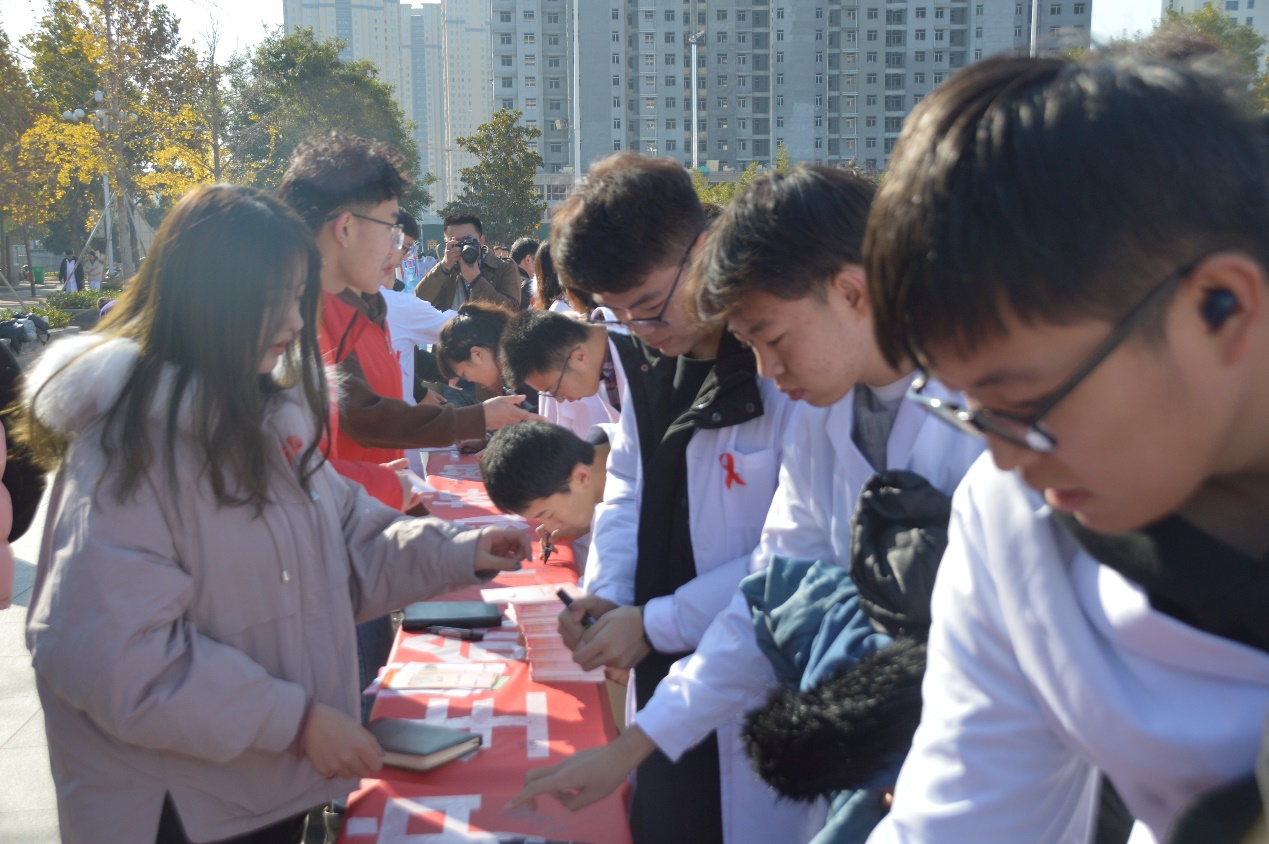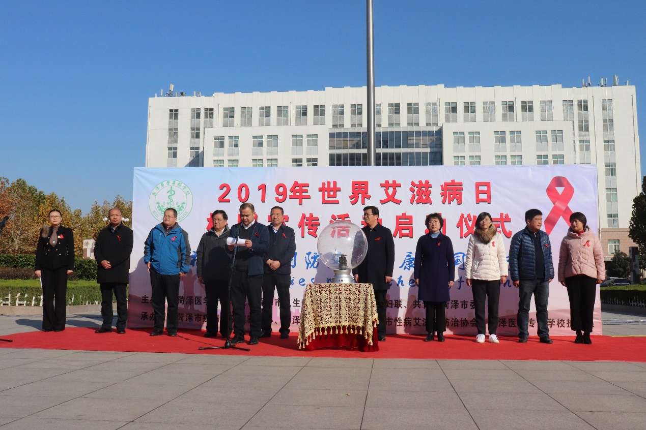 11月28日上午,在第三十二个世界艾滋病日来临之际,由我校护理系党总支联合菏泽市卫生健康委员会、市妇联、共青团菏泽市委、市疾控中心、市传染病医院、市性病艾滋病防治协会举办的2019年世界艾滋病日校园宣传活动启动仪式在石泉广场举行。校党委委员、副校长张传宝,菏泽市卫健委副主任赵胜利,各单位负责人及我校学生处、各系部负责人、辅导员代表出席了启动仪式,团委副书记于淼主持启动仪式。