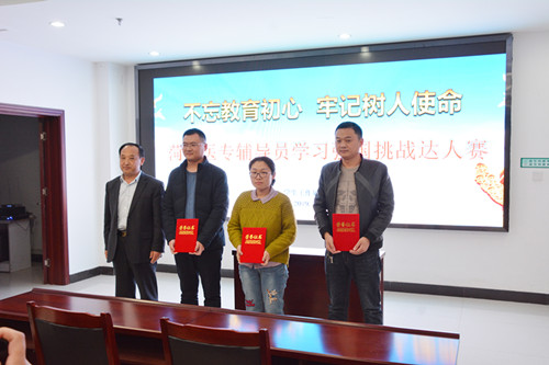 为深入扎实开展“不忘初心、牢记使命”主题教育,确保主题教育入脑入心、落地见效,充分调动我校全体辅导员学习的积极性,11月29日下午,我校在第三会议室举办“不忘教育初心,牢记树人使命”辅导员学习强国挑战达人赛。学生工作处处长郭树榜,各系党总支书记等到场并担任比赛评委。全体专兼辅导员60余名参加本次比赛。