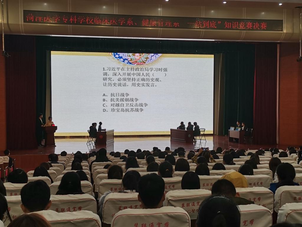为进一步提高同学们的学习自觉性和积极性,将“不忘初心、牢记使命”主题教育活动推向深入,11月30日,临床医学系和健康管理系在学校大礼堂联合举办“学习强国 一站到底”知识竞赛活动。本次竞赛共有8支代表队参加,比赛分为初赛和决赛两个环节。
