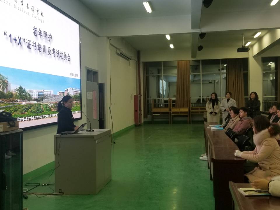 为推进我校“1+X”证书制度试点工作,11月20日,教务处在文体楼三楼社会培训中心举行老年照护“1+X”证书培训及考试动员会。教务处处长代爱英、护理系主任马国平、老年照护证书工作组相关教师及300余名学生参加动员会。