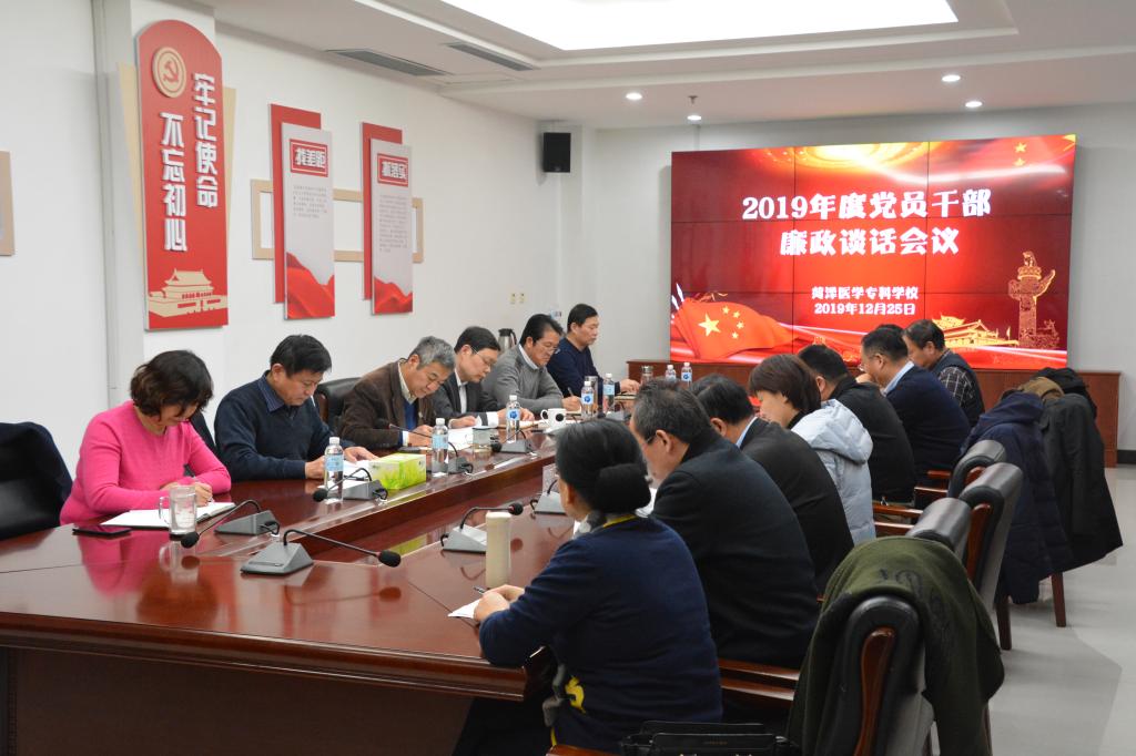 为深入贯彻落实全面从严治党,进一步推进党风廉政建设,提高党员干部廉洁自律意识,按照《菏泽医专领导干部廉政谈话实施办法》(菏医字〔2019〕16 号)文件要求,12月25日,我校召开党员干部廉政谈话会议。学校党委委员、纪委委员、党务部门负责同志、各党总支(直属党支部)书记等参加会议。