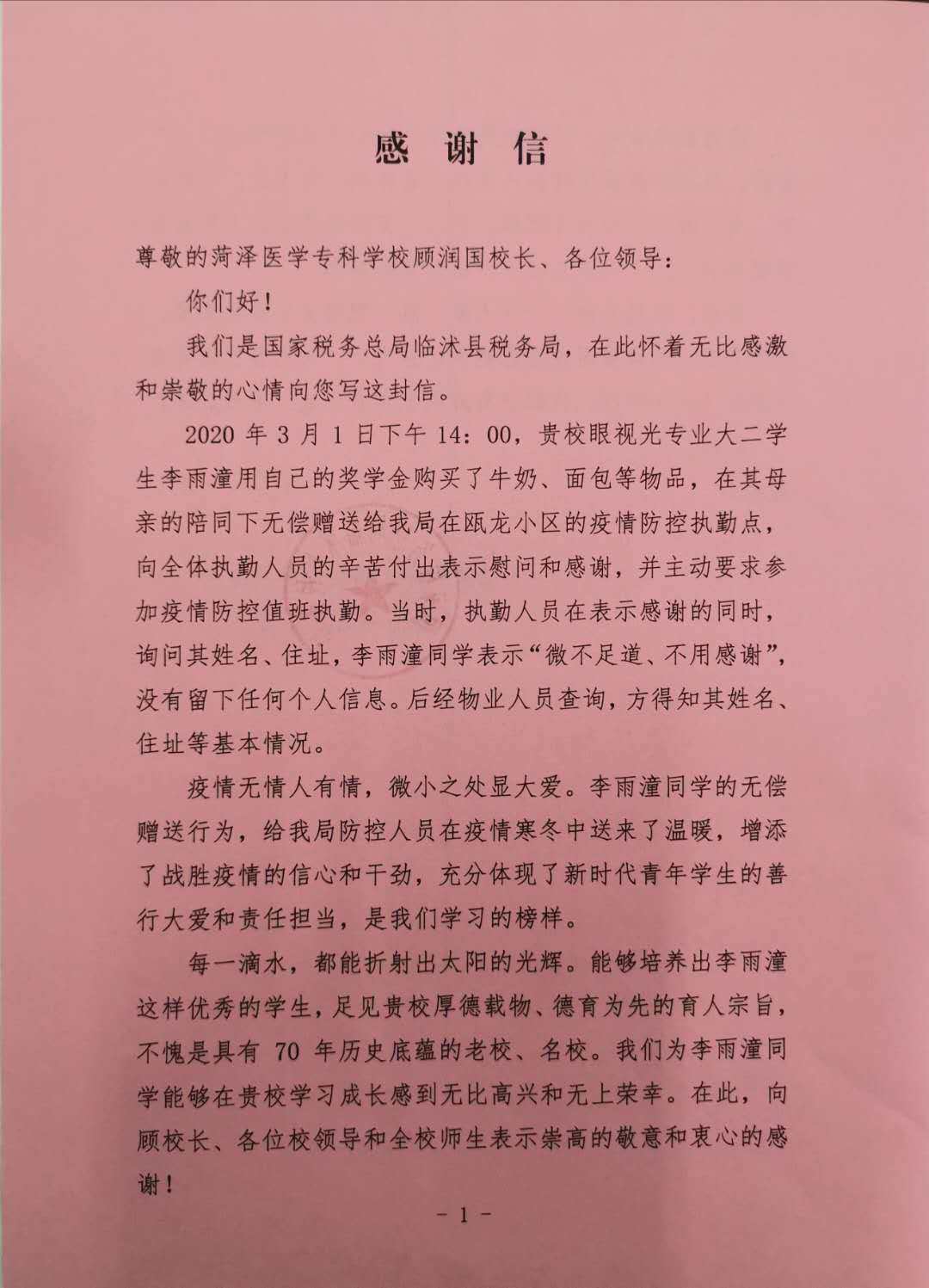 2018级李雨潼同学用奖学金购买牛奶、面包等物品,捐赠给临沭县税务局在瓯龙小区设立的疫情防控执勤点。
