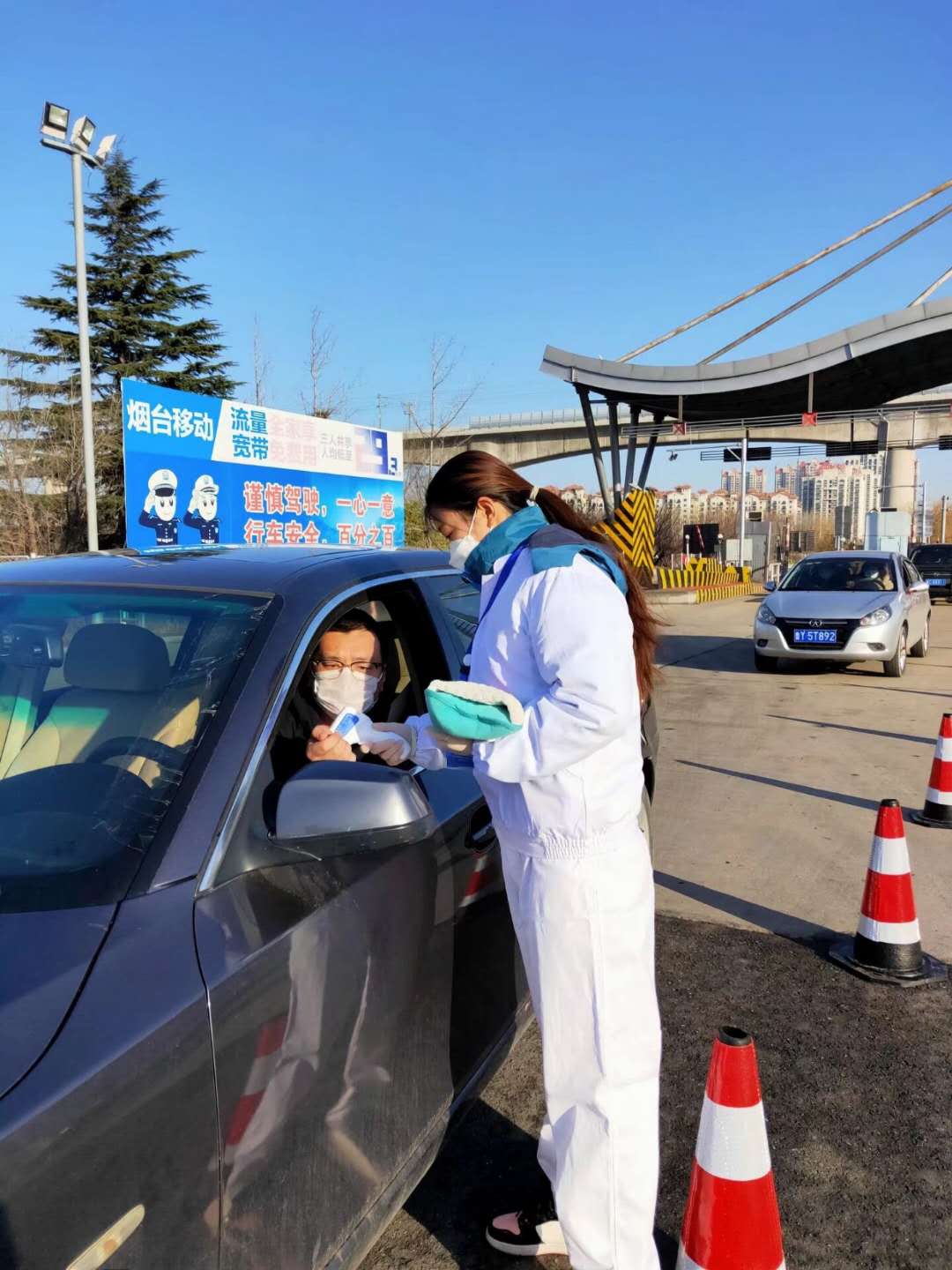 2019级临床1班(省属公费班)王文婧同学在疫情期间,志愿参加牟平区防控工作,图为在高速路口对过往车辆进行检测。