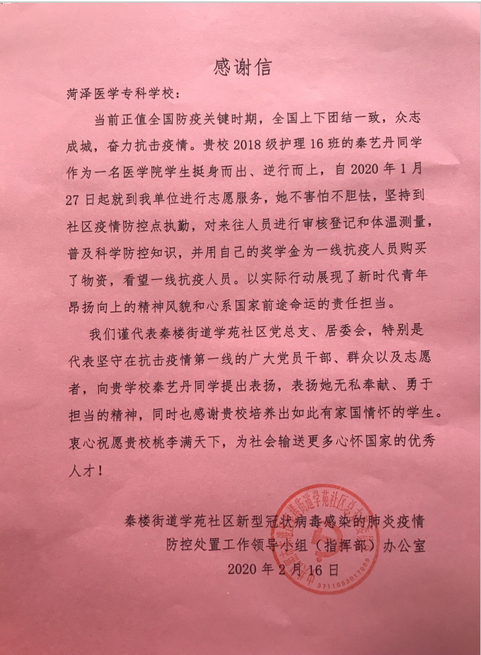 2018级护理专业16班秦艺丹同学参加当地防疫志愿者工作,并用奖学金为一线抗疫人员捐赠物资。