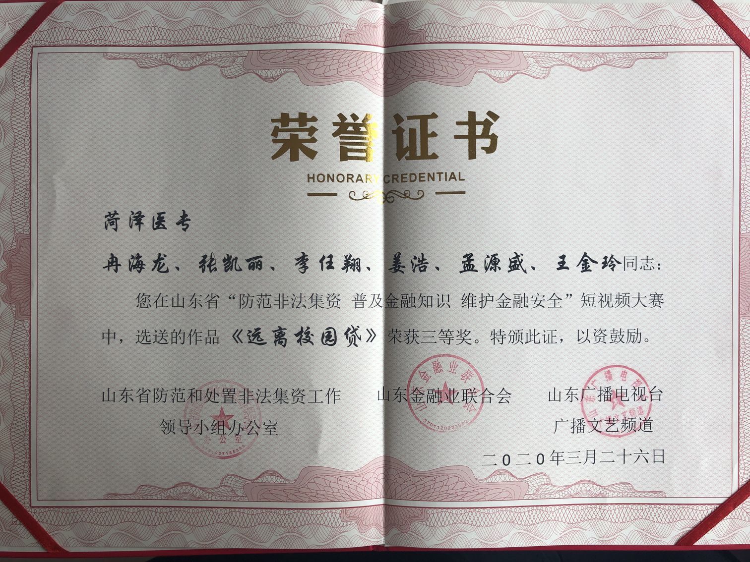 3月26日,由冉海龙老师指导,张凯丽、李任翔、姜浩、孟源盛、王金玲四位同学拍摄的短视频《远离校园贷》在“防范非法集资普及金融知识维护金融安全”中荣获三等奖。