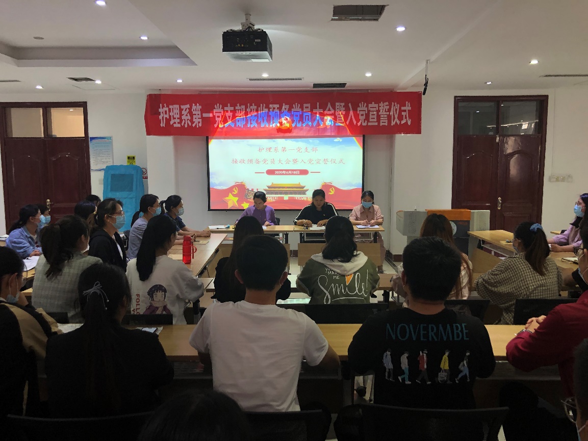 6月18日下午,护理系第一党支部在2号教学楼第三示教室举行接收预备党员大会暨入党宣誓仪式。护理系主任马国平、党支部全体正式党员、入党介绍人及发展对象参加会议。