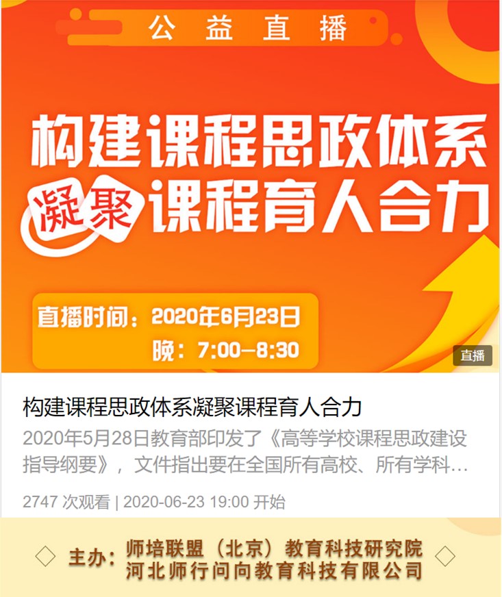 6月23日晚,我校校长顾润国应邀通过师培联盟教育科技研究院平台,以“构建课程思政体系凝聚课程育人合力”为主题,面向全国做“课程思政”公益直播讲座。