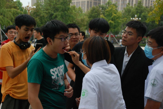 本次活动主要目的是为同学们检查牙齿健康状态。在口腔系老师们的引导下,同学们排队依次领取菌斑染色剂,咀嚼后漱口可清晰的观察到刷牙后牙 齿表面细菌的残留分布,并了解到牙齿因细菌等微生物易发生龋坏的部位。