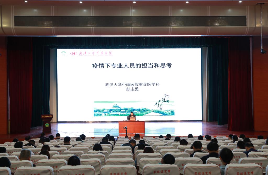 本次主讲人为武汉大学中南医院重症医学科主任,武汉雷神山医院ICU主任、中华医学会重症医学分会委员暨湖北省候任主任委员、中国研究型医院学会危重医学专业委员会副主任委员彭志勇教授,他以“疫情下专业人员的担当和思考”为题,从专业人员的担当和我们的思考两个方面,同时结合自身抗疫经历,为我们讲述了在来势汹汹的疫情之下,彭教授及团队迅速成立了武汉大学中南医院重症隔离病区及武汉市第七医院ICU、组建雷神山医院ICU,并且在湖北省率先采用ECMO技术治疗新冠肺炎重症患者,最大程度的挽救患者生命,彭教授及其团队为抗疫工作做出了卓越贡献,在灾难面前,没有从天而降的英雄,只有挺身而出的凡人。最后,彭教授与在座的师生进行了互动与交流,解答了有关新冠疾病病理学的问题。