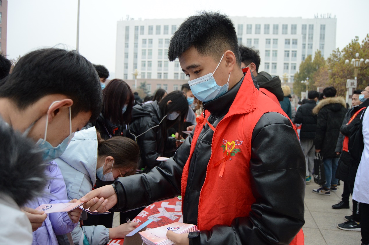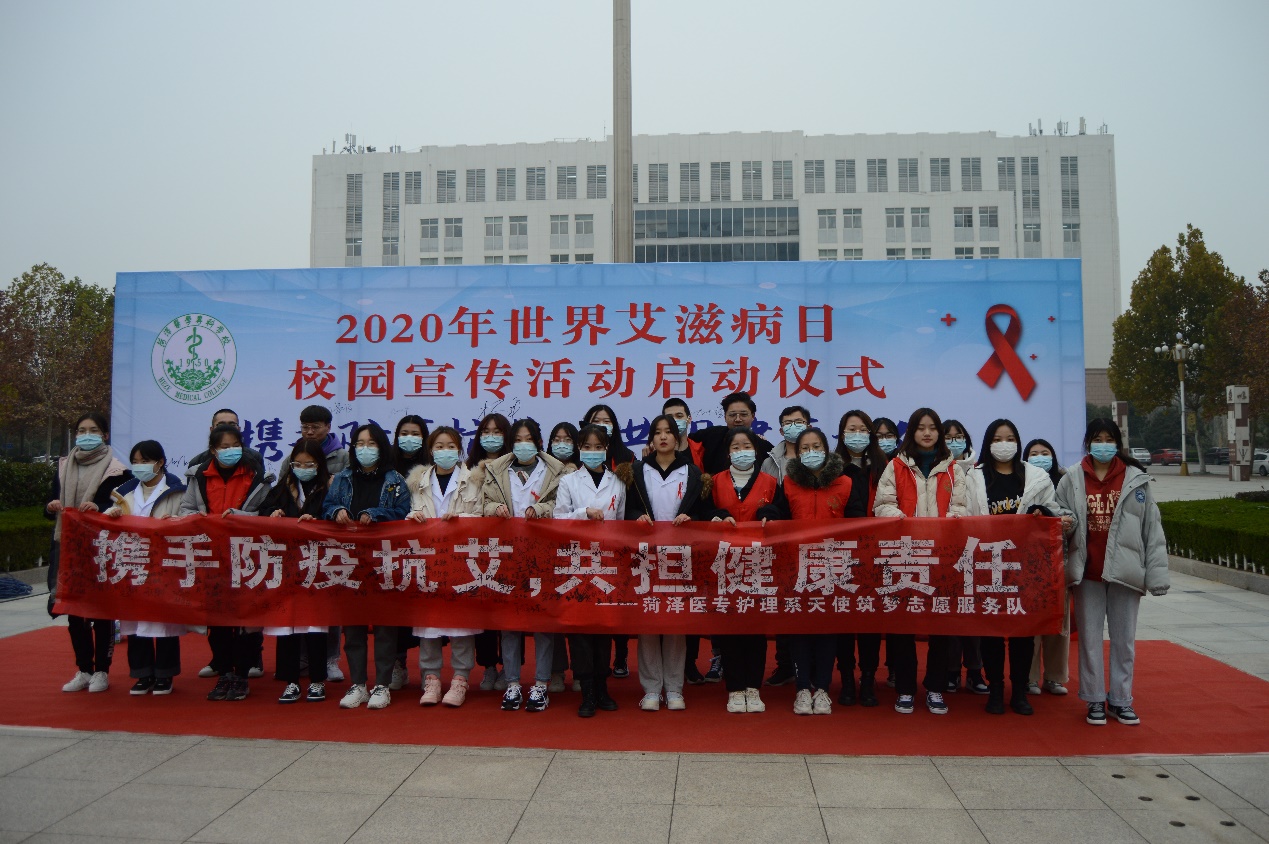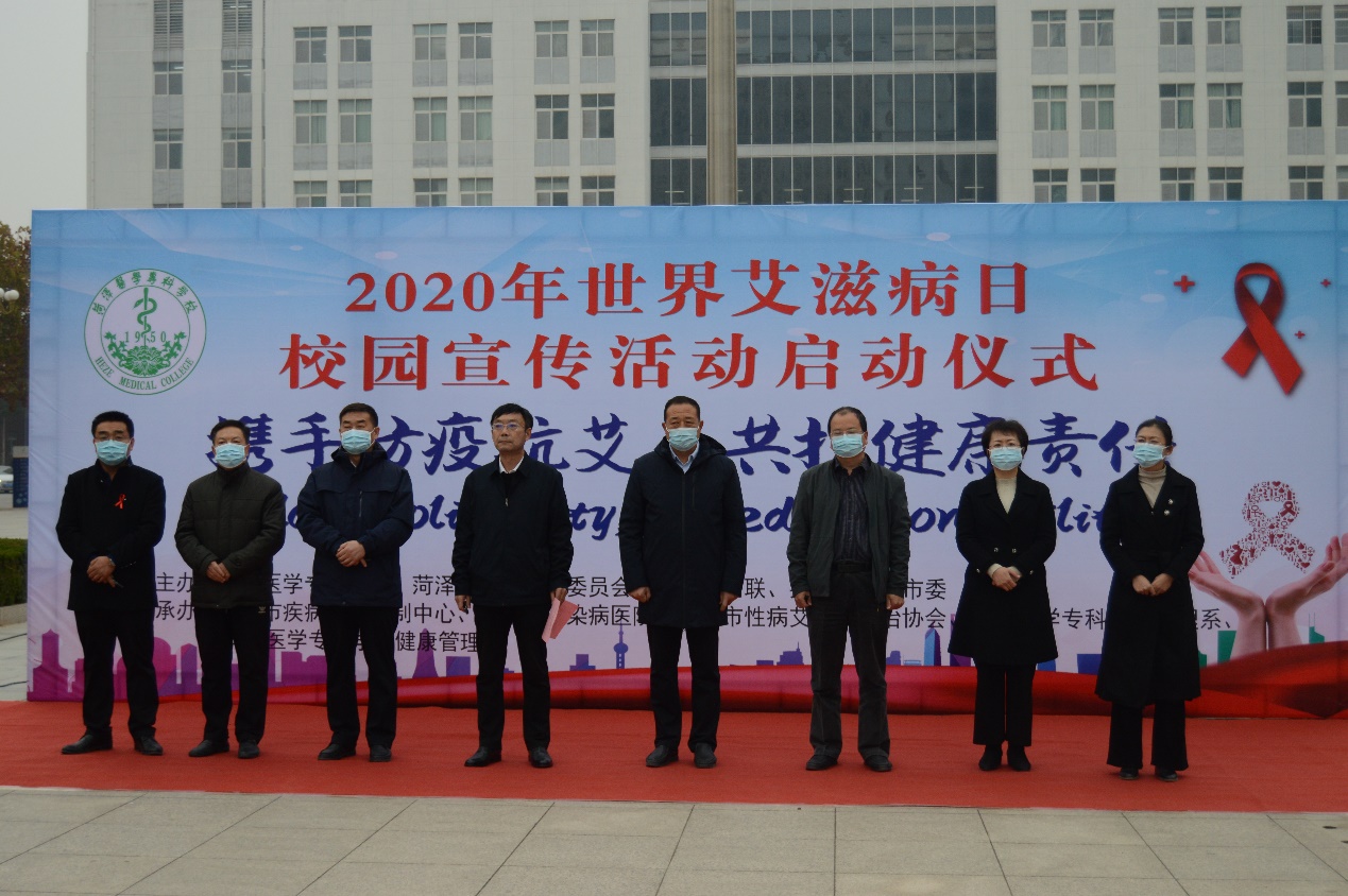 今年12月1日是第33个世界艾滋病日,主题为“携手防疫抗艾,共担健康责任”.当天,我校护理系、健康管理系联合菏泽市卫生健康委、菏泽市妇联、共青团菏泽市市委,在石泉广场举办2020年世界艾滋病日校园宣传活动启动仪式。我校副校长张传宝,市卫生健康委员会党组副书记、副主任杨军,市卫生健康委疾控科科长刘心华,市疾病预防控制中心主任助理、市性病艾滋病防治协会副会长刘景顺,各有关单位负责人及我校学生处处长郭树榜等人出席了启动仪式,仪式由校团委书记于淼主持。