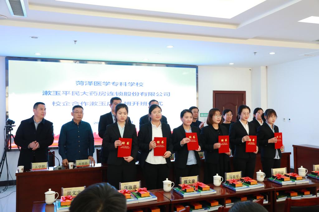 漱玉平民店长班学生代表、带教老师代表发言。孙旭豪同学代表学生做出学习承诺,高文静老师对学生以后的学习提出了期望。菏泽医专与漱玉平民校企合作店长班开班暨认师仪式圆满完成。(校企合作与培训就业处 赵松芳/文 王学贺/审核)