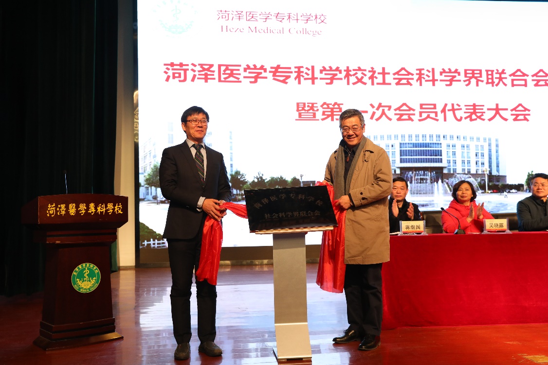 1月13日上午,菏泽医学专科学校社会科学联合会成立暨第一次会员代表大会在学校学术报告厅召开。山东省社科联党组成员、副主席张宏明,菏泽市社科联党组书记、主席王志华,菏泽市社科联党组成员、秘书长荣海生,菏泽医专党委书记于洲声、党委副书记周长文、纪委书记吴晓露、副校长张传宝、副校长蒋继国及第一次会员代表大会全体代表出席了会议。会议由周长文主持。省社科联张宏明副主席和菏泽医专于洲声书记为“菏泽医学专科学校社会科学界联合会”揭牌。