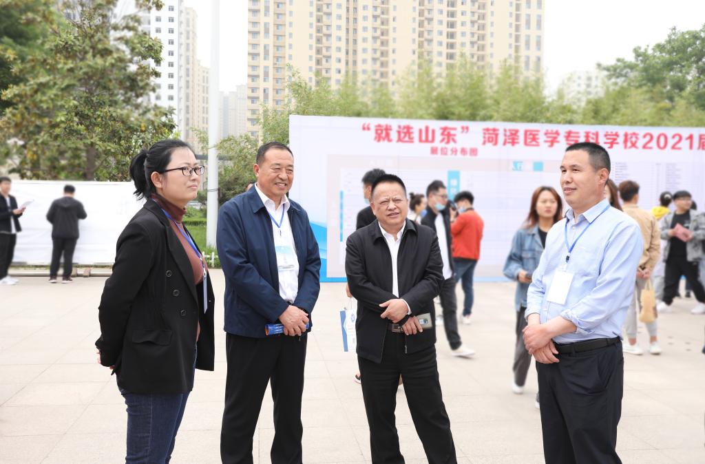 5月11日,“就选山东”2021年山东省高校毕业生求职招聘活动——菏泽医学专科学校专场招聘会在我校石泉广场成功举办。校党委委员、副校长张传宝亲临现场,询问、了解了参会单位人才需求信息和毕业生应聘情况;菏泽市人力资源和社会保障局党组成员、就业办主任李迁一行现场调研,对毕业生就业政策进行宣传、讲解;各系党政负责人、相关辅导员老师对毕业生进行现场面试指导。