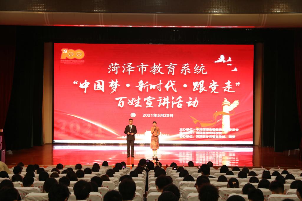 为庆祝中国共产党成立100周年,营造共庆百年华诞的浓厚氛围,增强广大党员群众爱党信党护党跟党走的信心和决心,5月20日,菏泽市教育系统“中国梦·新时代·跟党走”百姓宣讲活动在我校学术报告厅举行。菏泽市委宣传部和市委教育工委相关领导出席本次宣讲活动,各参赛单位相关负责人担任本次宣讲比赛的评委。我校党委委员、副校长蒋继国致欢迎词,菏泽市教育局党组成员、总督学蒋银忠发表致辞。部分教职工及学生观看了本次宣讲。