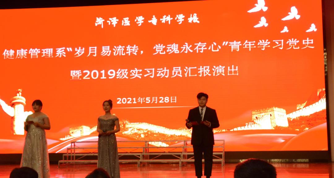 5月28日,我校健康管理系党总支在学术报告厅举办“岁月易流转 党魂永存心”青年学习党史暨2019级实习动员汇报演出,学生工作处、团委、总务处、各系部部分党政负责人,健康管理系专兼职辅导员及学生500余人观看演出。