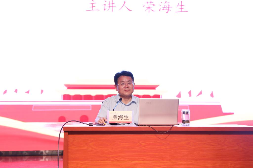 荣海生以《牢记初心使命,学党史,悟思想,跟党走》为主题,围绕着党的建立、发展、稳固和飞跃,菏泽早期党组织创始之艰难,抗日战争时期的中流砥柱作用,解放战争时期的奉献,改革开放强国征程等方面,引用大量地方党史史料和考察资料,解读了在党中央的领导下,菏泽地方党组织带领人民进行革命、建设和改革开放的伟大实践,宣传了中国共产党百年辉煌历史和丰功伟绩,为全校师生进一步深入学习党的百年历史、扎实有效开展党史学习教育具有深刻启迪和指导意义。