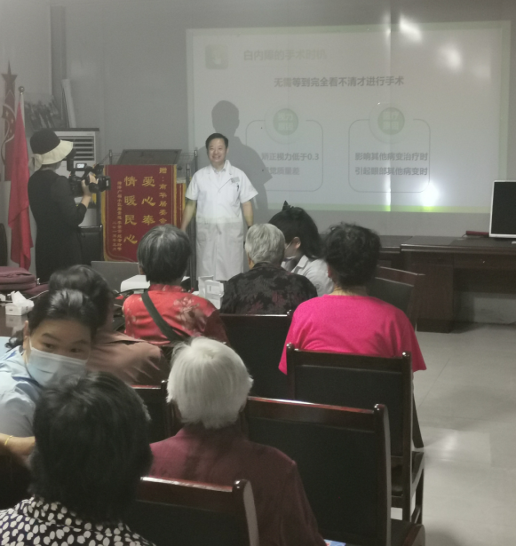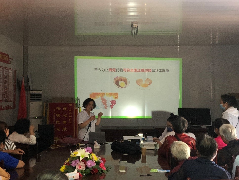 6月6日,开展健康科普专家下基层活动。在西城办事处南华社区举办眼健康大讲堂活动——老年眼健康,由王勇教授和戴馨教授为老年人开展健康爱眼科普讲座,提高眼健康知晓度,提升群众眼病防治意识,培养正确就医理念。