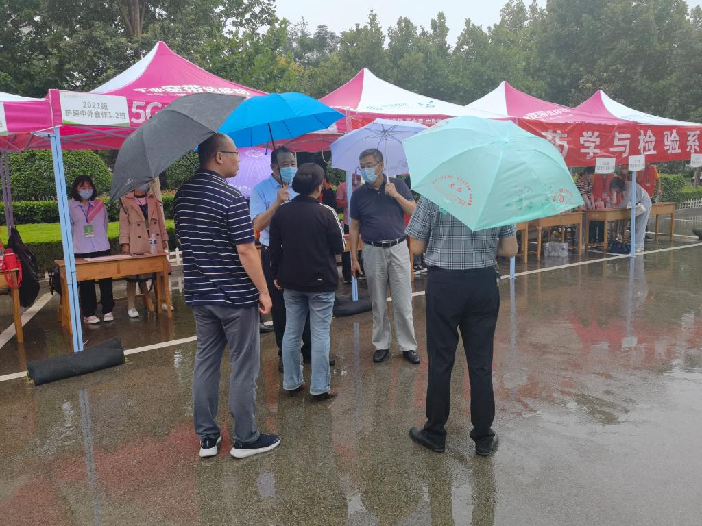 学校党委书记于洲声,副校长张传宝等校领导冒雨在报到现场看望新生、慰问迎新工作人员并指导工作,随后,于书记等校领导又深入学生餐厅、宿舍,了解学生饮食、住宿安排等,确保迎新工作平稳进行。