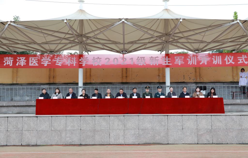 10月11日上午,我校在体育场举行2021级新生军训开训仪式,学校党委副书记周长文、副校长张传宝、军分区参谋李兆强、刘腾,菏泽学院学工处副处长张华光、我校学工处处长孙战、团委书记于淼、各系部书记、全体教官及2021级全体新生参会。