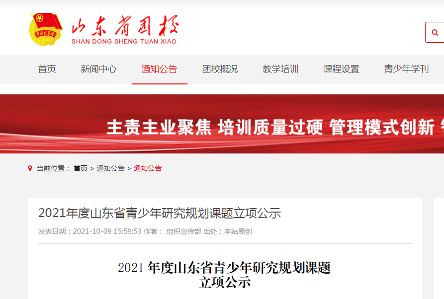 近日,山东省青少年研究规划管理办公室公布2021年度山东省青少年研究规划课题立项名单,我校思政部宋鑫老师申报的《党史教育对青少年社会主义核心价值观培养的意义研究》课题获得立项。