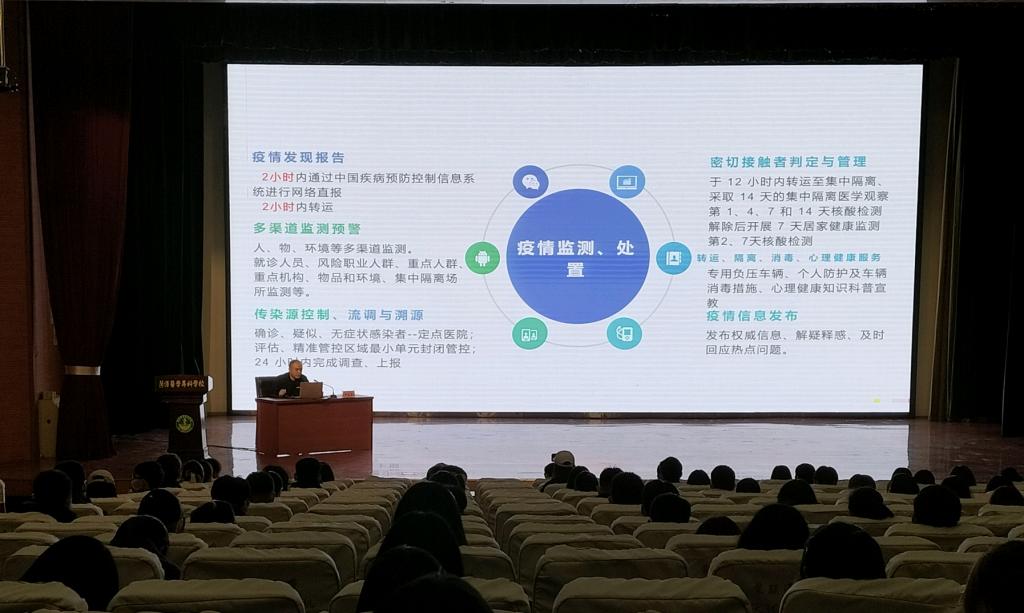 为进一步做好我校新冠肺疫情炎常态化防控工作,增强全体师生的防控意识及防控技能,营造安全的卫生校园环境,11月12日,我校在学术报告厅举办新冠疫情防控知识培训讲座。培训由学生工作处长孙战主持,附院医务科、疫情防控办公室何友立副教授主讲,全体辅导员及学生代表参加本次讲座。