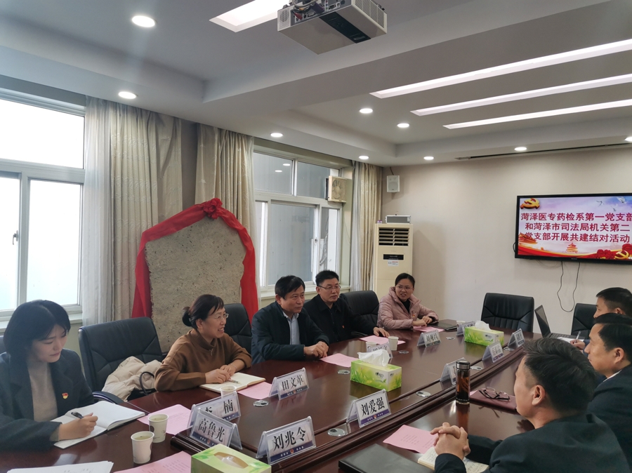 为加强基层党建工作,进一步促进党建优势互补,以党建联建引领工作,创新党建工作方式方法,提高党总支战斗力与凝聚力,11月30日下午,我校药学与检验系前往菏泽市司法局开展党建结对共建活动,我校党委副书记周长文,药学与检验系党总支书记田文革,药学与检验系主任刘观昌,药学与检验系第一党支部书记李楠,菏泽市司法局党组书记、副局长姜东生,副局长、机关党委书记岳彩雷,办公室主任、机关第二党支部书记刘爱强等有关同志参加了会议。