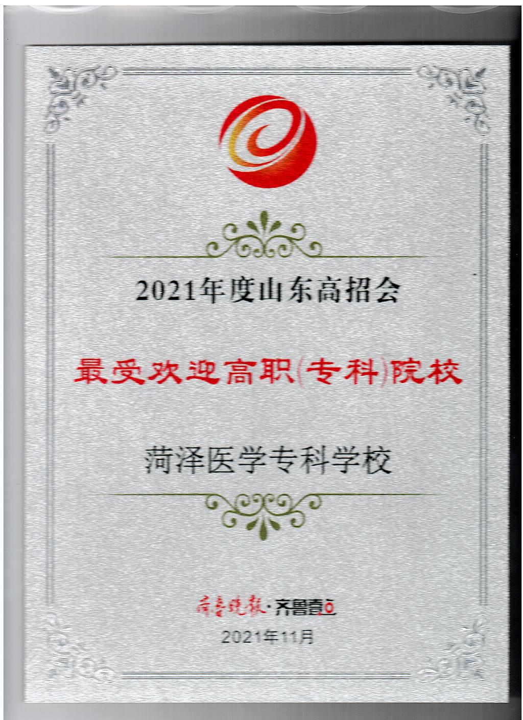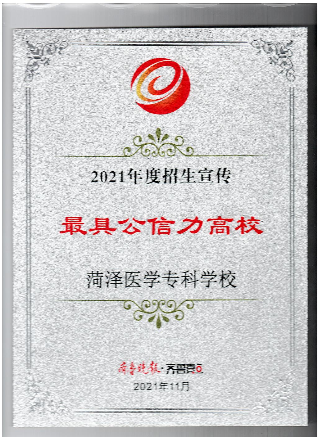 近日,齐鲁晚报发布2021年度招生工作荣誉榜单,我校招生工作获得“2021年度招生宣传最具公信力高校”“2021年度山东高招会最受欢迎高职(专科)院校”两项荣誉。