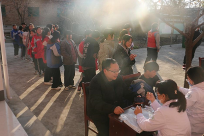 活动中,宋恒国向高庄镇中心初级中学老师们宣传学习了党的十九届六中全会的精神,为老党员同志送上了慰问品。口腔系教师李瑞飘为师生们普及口腔健康知识,向大家生动讲解了bass刷牙法及牙线的使用,增强其对口腔卫生的预防保健观念。义诊咨询服务在行政办公院内进行,口腔系教师们设立咨询台,为高庄镇中心初级中学师生提供免费的血压测量,口腔检查与诊断,大大提高了师生们的医学常识和口腔保健意识。活动现场还为全体教师赠送了牙刷和洗漱杯等口腔保健用品以及口罩、消毒液等防疫物资。