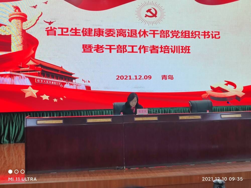 12月9日,全省卫健系统离退休干部党组织书记暨老干部工作人员培训班在青岛召开,我校代表在会上作了题为《突出政治引领,打造党建和文化养老“双品牌”,推动离退休工作向高质量迈进》典型发言。省卫健委党组成员、副主任于富军、离退休干部党委书记康永军及机关离退休干部党组织书记、委员、委属单位老干部工作负责人等80多人参加了会议,参会委属单位33个。