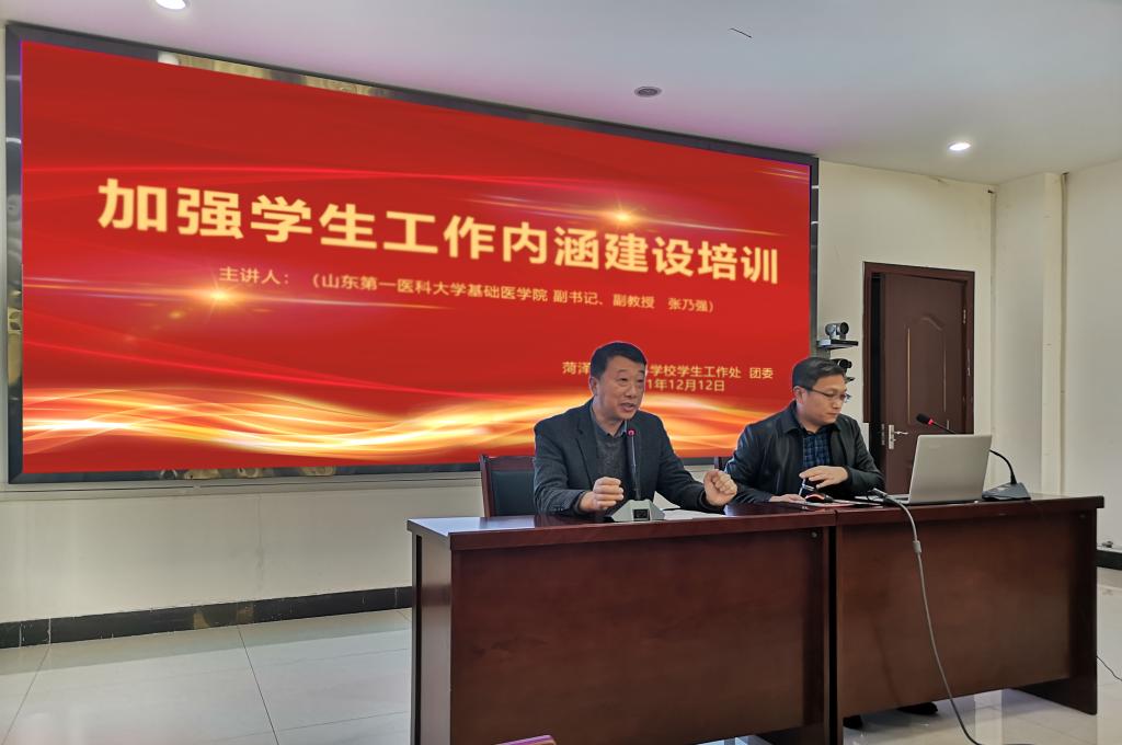 张乃强以“立德树人担使命,做好学生成才的引路人”为题为大家作了精彩的报告,介绍了山东第一医科大学的学生管理工作模式和好的做法,从专业角度出发,结合丰富的实践案例,从我们是谁、我们为谁、我们要让学生成为谁、付出就有收获四个方面为我们理清辅导员的定位、职责及学生工作的方法和艺术。激励我校辅导员积极学习,努力工作,为菏泽医专的更好发展燃烧自己的青春和热血。