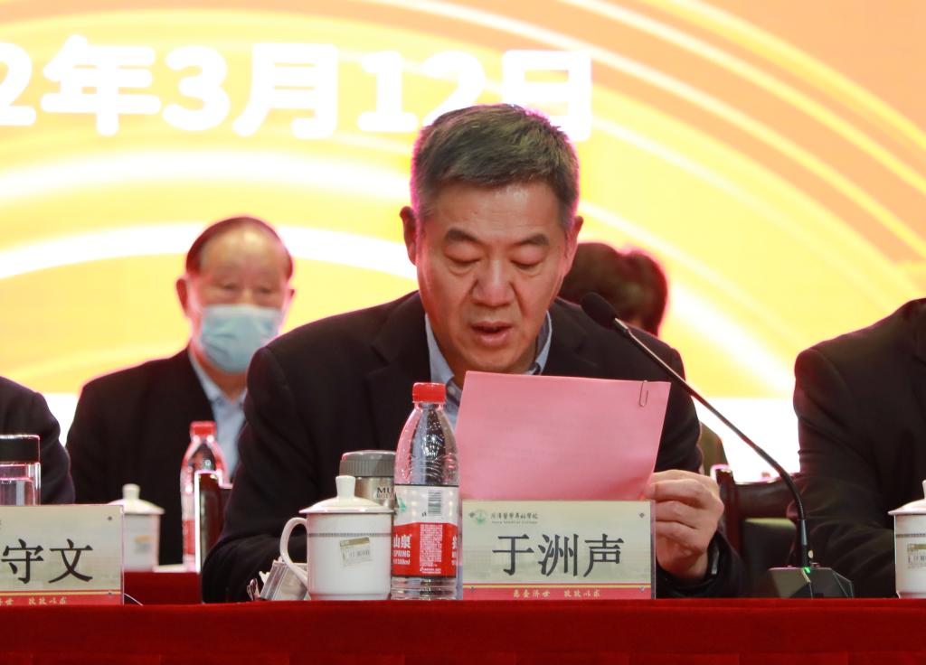 下午14时30分,第八届“双代会”第一次全体会议在学术报告厅举行。于洲声致开幕词。他提到,过去一年学校坚持和加强党对高校的全面领导,扎实开展党史学习教育;统筹抓好常态化疫情防控,切实维护师生健康安全;于洲声充分肯定“双代会”在学校民主管理、事业发展中的重要作用,对加快学校科学发展,提升学校内涵建设提出明确要求,希望全体教职工以更加饱满的精神状态做好2022年的工作,谱写学校事业发展的崭新篇章。